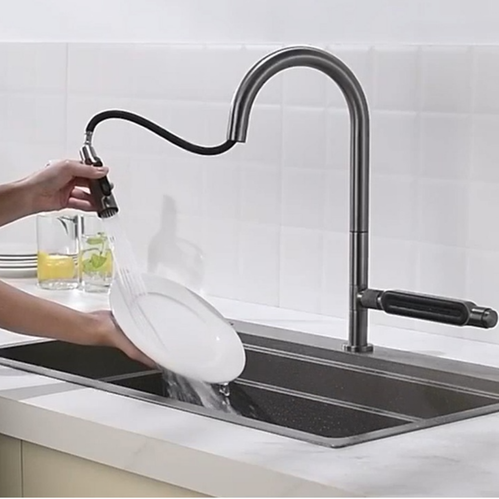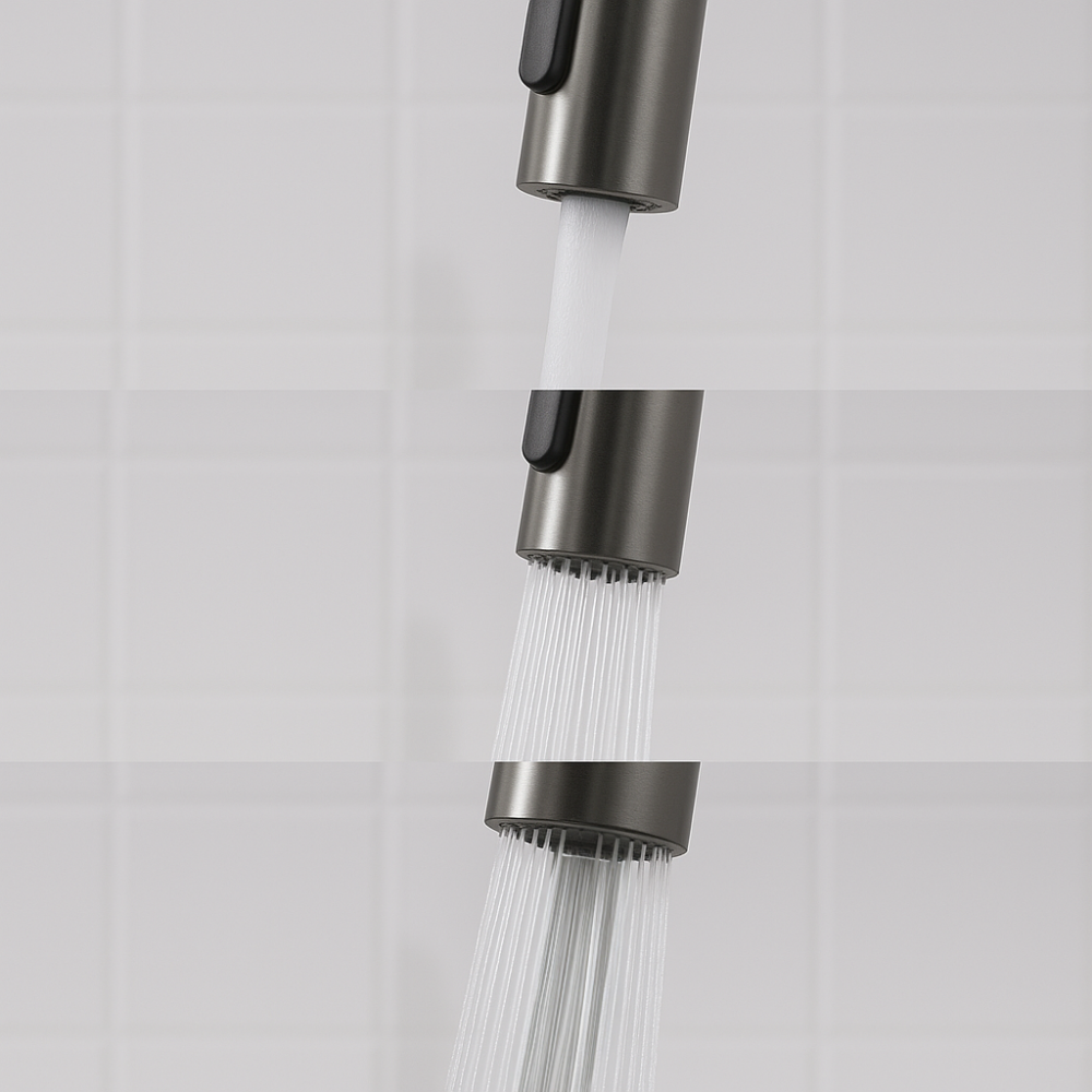 Çekilebilir Sprey Başlık, esnek hortumu sayesinde ulaşılması zor alanlarda kolay kullanım sağlar. Farklı akış modlarıyla ister yoğun temizlik, ister nazik durulama için ideal çözümler sunar.