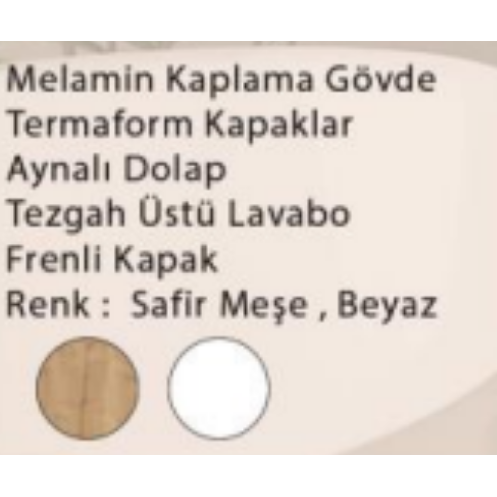 Dikey çizgili Termaform kapaklar, doğal Safir Meşe gövde ve tezgâh üstü yuvarlak lavabo ile modern ve sıcak bir görünüm sunar. Açık raflı tasarım, frenli kapaklar ve form aynalı dolap ile hem şık hem fonksiyonel bir modeldir.