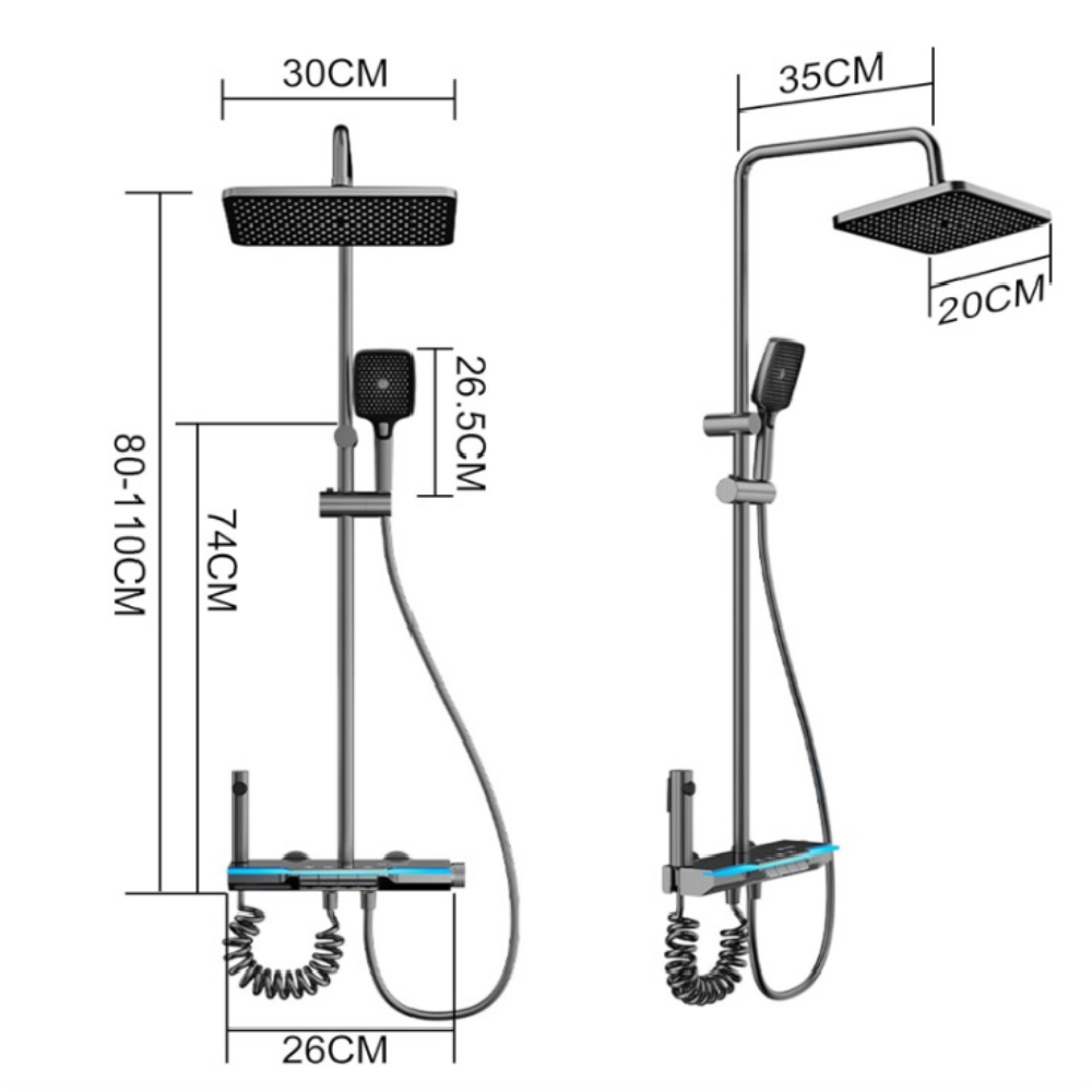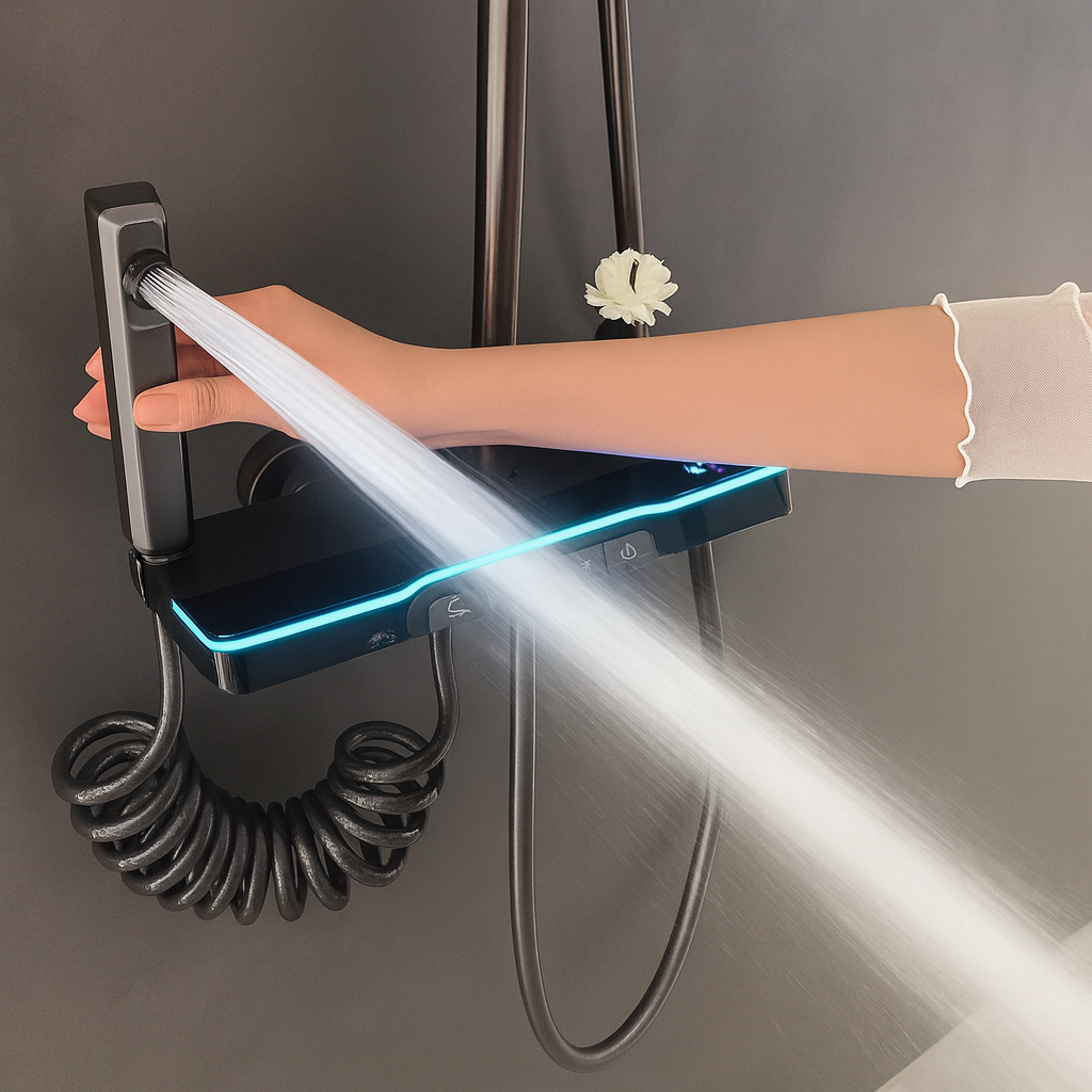 AQUARİS TERMOSTATİK DİJİTAL PİYANO TUŞ KONTROLLÜ DUŞ SETİ GUN GREY, teknolojiyi konforla buluşturan premium bir duş deneyimi sunar. Geniş yağmurlama tepe duşu hava takviyesiyle suyu yumuşatıp debiyi optimize ederken, üç kademeli el duşu günlük kullanımdan yoğun durulamaya kadar farklı ihtiyaçlara cevap verir. Piyano tuşlu ön panel tek dokunuşla üst duş, el duşu ve yardımcı yıkama çıkışlarını yönetmenizi sağlar. Termostatik kartuş sabit ısıda akış verir, dijital ekran anlık su sıcaklığını gösterir ve 38°C güvenlik kilidi sürpriz sıcaklık değişimlerini engeller. Entegre raf ve kompakt gövde banyoda düzen ve ergonomi sağlar, Gun Grey kaplama modern bir görünüm ve yüksek dayanım sunar.