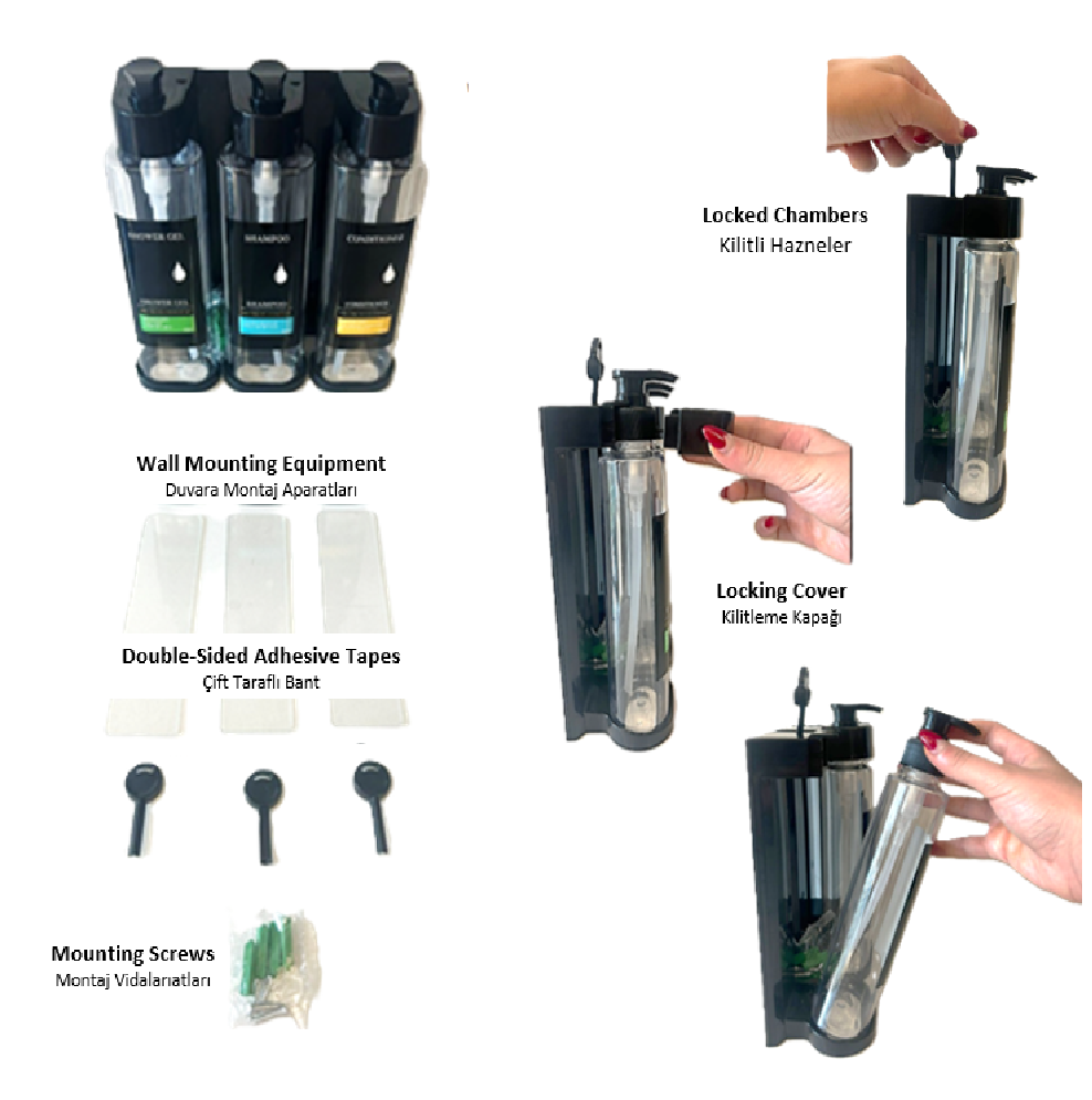 3 ayrı hazne: Şampuan, duş jeli ve krem için etiketli bölmeler.