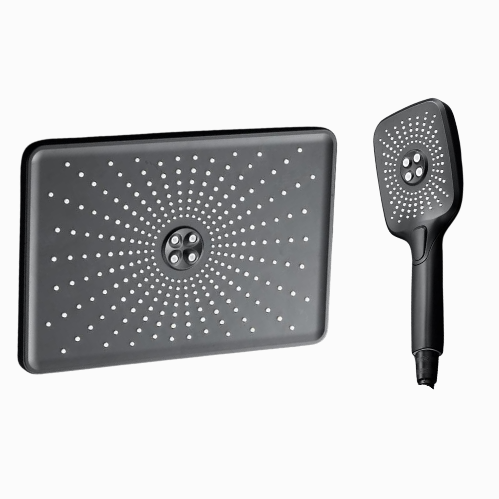 Carmen Tepe ve El Duşu, mat siyah yüzeyi ve modern hatlarıyla banyolarda zarif bir görünüm yaratır. Geniş tepe duşu, güçlü ve dengeli su akışıyla rahatlatıcı bir duş deneyimi sunarken; 3 fonksiyonlu el duşu farklı akış seçenekleriyle kişisel konfor sağlar. Dayanıklı ABS gövde ve kaliteli kaplama uzun ömürlü kullanım garantiler.