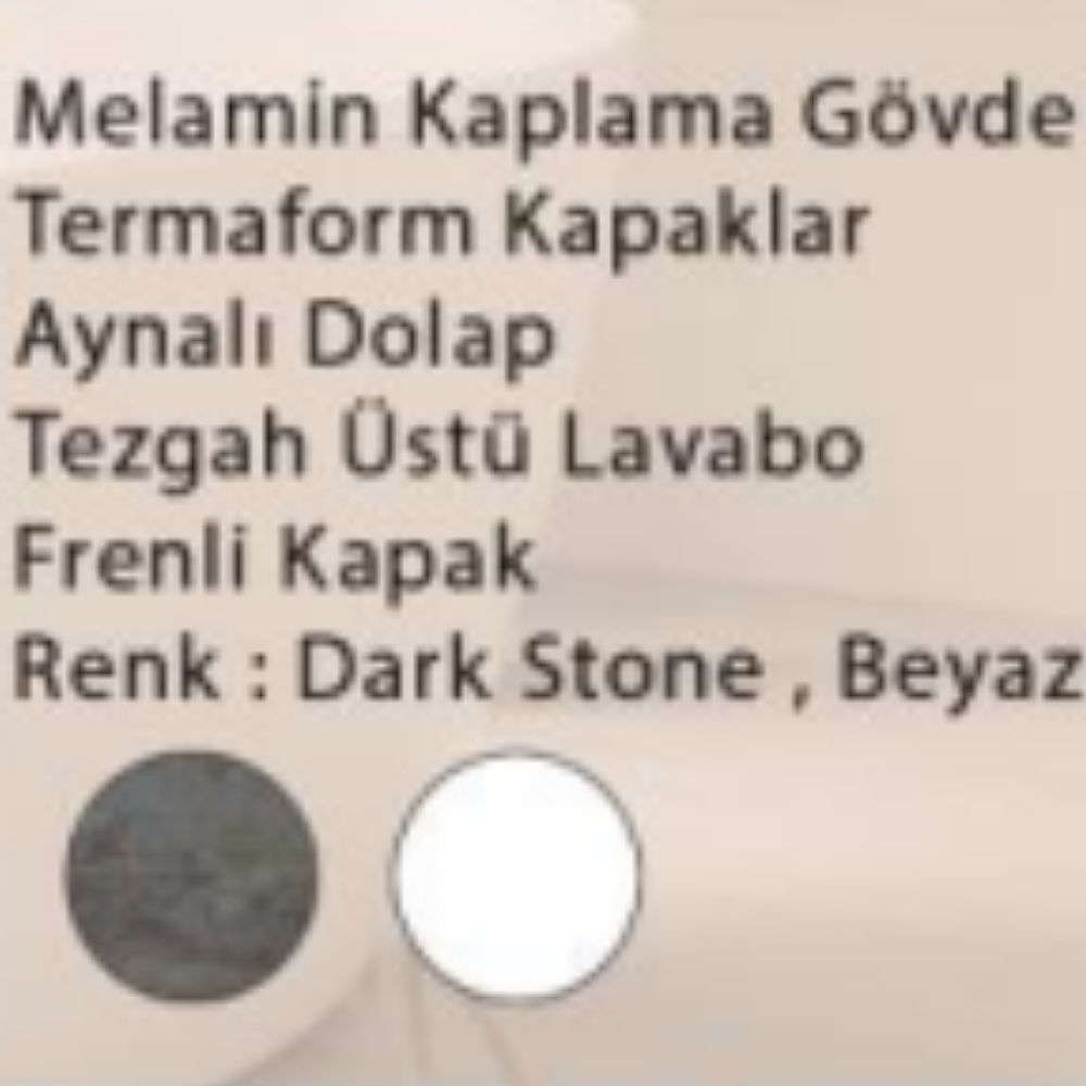 Melamin gövde, Termaform Dark Stone kapaklar, frenli kapak sistemi ve tezgâh üstü lavabo ile hem uzun ömürlü hem şık bir kullanım sunar. Aynalı dolap ekstra depolama sağlayarak takımı tamamlar.