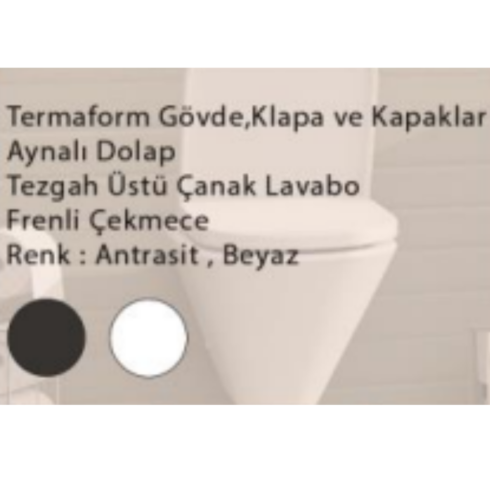 Diyagonal çizgili Termaform kapakları, güçlü antrasit rengi ve şık çanak lavabosu ile modern bir tasarım sunar. Frenli çekmece ve asimetrik aynalı dolap sayesinde hem estetik hem fonksiyonel bir çözümdür.