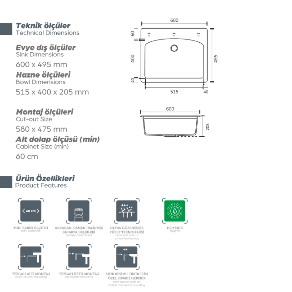 60×49,5 CM POL60 POLEX GRANİT EVYE