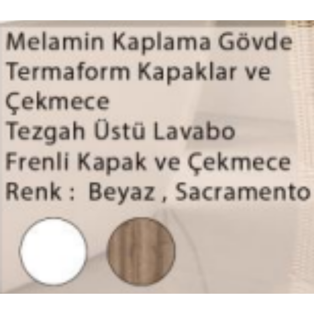 Melamin kaplama dayanıklı gövde, Termaform kapaklar, frenli çekmece–kapak sistemi ve tezgâh üstü lavabo ile hem şık hem uzun ömürlü bir kullanım sunar.